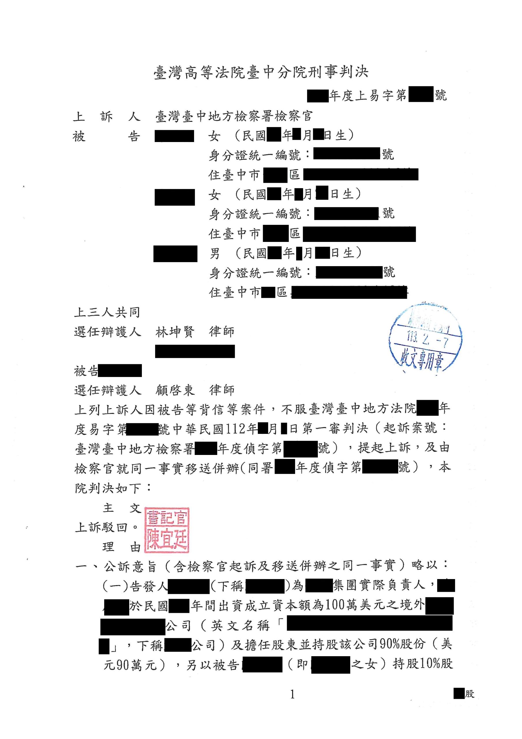 當事人等人來本所諮詢,其等為兄弟姊妹,於父母規劃下接手家族企業,分別擔任家族企業旗下之A公司董事長、董事等職務。之後,當事人等召開A公司董事會決議出售部分股權,未料,父親竟指控當事人等人賤賣A公司股權並對當事人等人提出背信之告訴。本所協助當事人等人提出相關交易資料給法院,證明當事人等決議之股權交易價格合乎市場行情,並無所謂賤賣之情形,最後,歷審法院均認為當事人等人之行為並未損害A公司之利益,並不構成背信,判決當事人等人無罪確定。