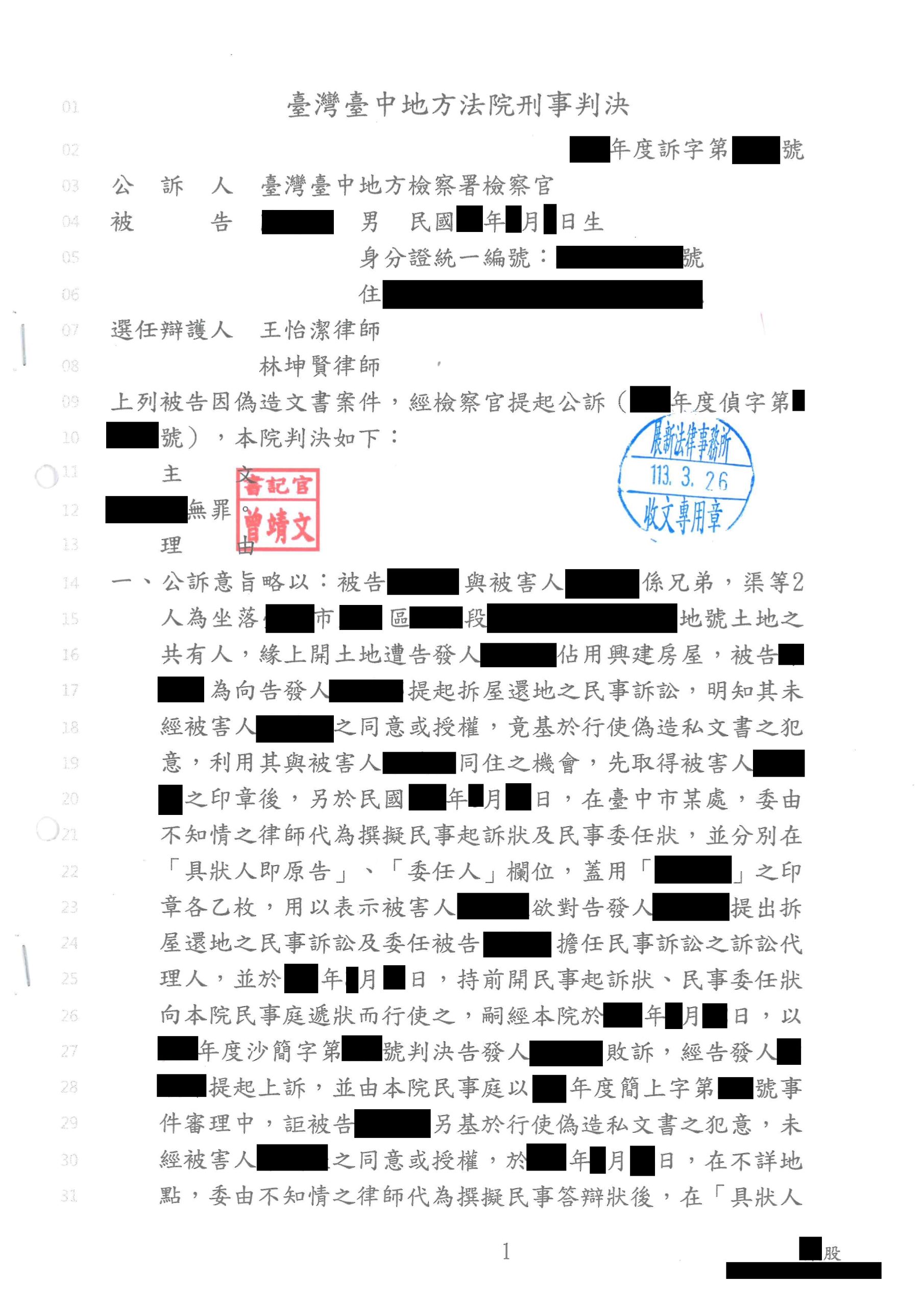 當事人與其兄長二人共有土地遭鄰居A無權占用興建房屋,當事人向兄長表示欲對鄰居A提起拆屋還地民事訴訟,因兄長為中度智能障礙者,難於法庭上正常陳述,兄長遂同意由當事人擔任訴訟代理人並授權當事人於書狀、委任狀上代替其用印。而鄰居A於拆屋還地案件一審敗訴後,心生不滿,知悉當事人兄長為中度智能障礙者,便誘導其說出其對拆屋還地訴訟毫無所悉,更遑論授權當事人用印等情並私下錄音,之後,鄰居A以錄音內容告發當事人盜用其兄長印章,涉嫌違反偽造私文書罪。本所律師為證明當事人之清白,聲請傳喚當事人兄長作證,其兄長向法院表示其無意控訴胞弟,鄰居A的錄音係刻意誘導所為,此外,本所律師指出身為中度智能障礙者之當事人兄長容易受人控制誘導,其多次證述內容皆有矛盾之處,根本無從證明鄰居A的錄音內容便為實情,最後,本所成功說服法院,讓當事人獲判無罪。
