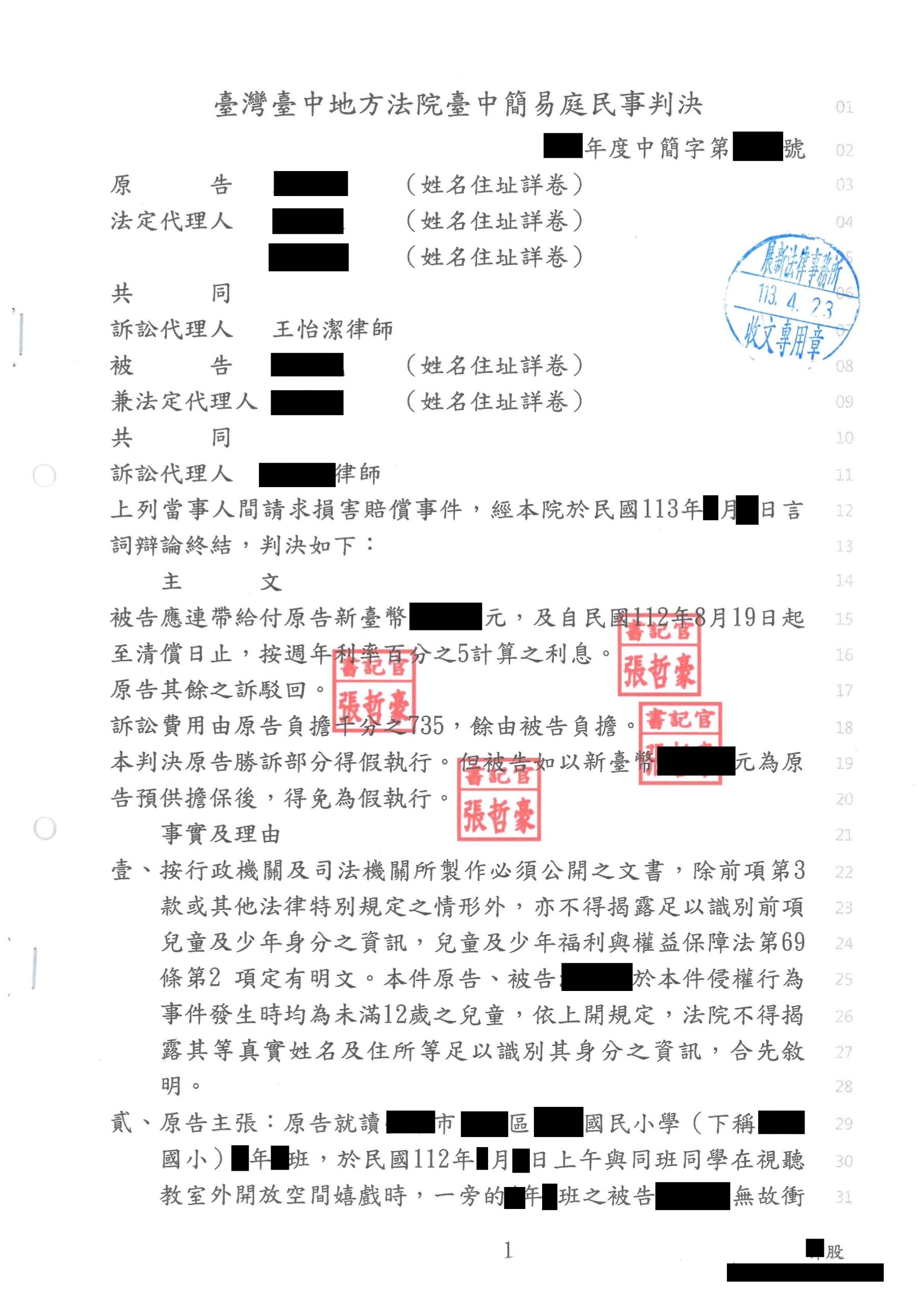 當事人之父母來本所委託案件,其等表示小孩在校與同學玩耍時,無故遭學長蓄意衝撞並按壓其頭部撞擊地面,導致其頭部受傷及眼鏡損壞,身心受創,當事人之父母與對方家長多次協商,但對方家長認為此僅為小孩間之嬉戲,兒子並非蓄意衝撞且當事人提出之精神慰撫金過高。本所協助當事人父母提起民事告訴並向法院提出監視器錄影畫面證明該名學長確實蓄意衝撞當事人,最終法院認定學長與其父母不僅須實支實付當事人的醫藥費用、眼鏡修繕費用,亦須給付精神慰撫金。