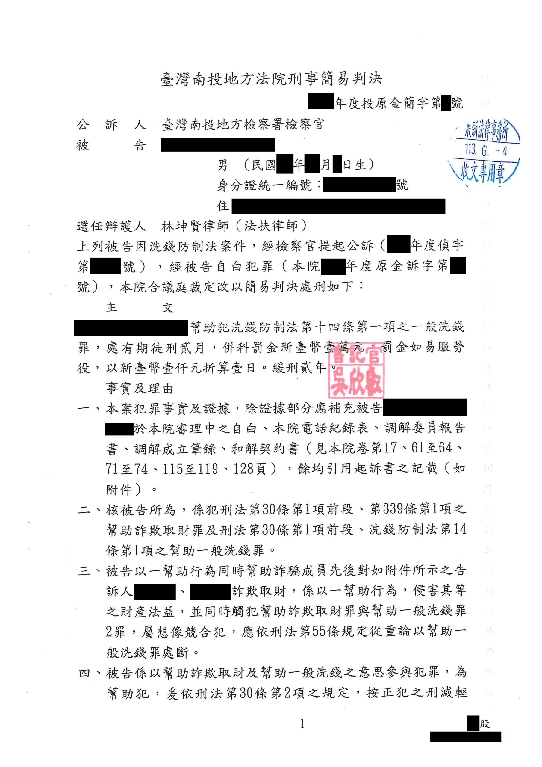 本所律師認為當事人因教育程度不高且經濟拮据,以致輕信詐騙集團之騙術,但當事人提供銀行帳號與密碼予不知名網友乃因對方提供高額之對價,亦即每月高達新台幣5萬之薪資及佣金分紅,縱使當事人從未領取所謂之薪資及佣金分紅,亦難以說服法官其對於網友可能利用其銀行帳戶做為洗錢工具一事毫無所悉,因此,本所建議當事人認罪並積極協助其與被害人達成和解,最後讓當事人成功獲得緩刑。